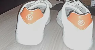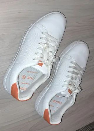 Zapatillas de la marca Roger en color blanco con detalles en naranja. Usadas tres veces - Diseño moderno y cómodo. - Suela de goma. - Cierre con cordones.