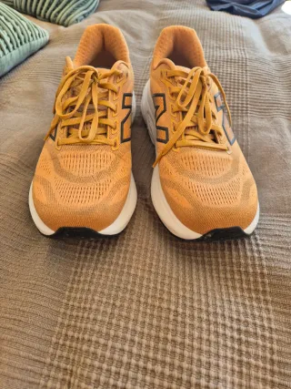 Zapatillas deportivas New Balance Usado 5 veces, necesito un modelo mas ancho. Buen estado en general, el texto en la suela ha desaparecido un poco. Color: Dried Apricot con White y Marmalade Info de New Balance: Esta amortiguada zapatilla de running de carretera para el día a día cuenta con un empeine de malla estructurado y transpirable que ofrece un confort máximo para poder llevarla puesta de forma ininterrumpida. La espuma de la entresuela Fresh Foam X, con aproximadamente un 3 % de contenido de origen biológico, ofrece nuestra experiencia Fresh Foam más amortiguada, logrando un confort increíble. Empeine estructurado per