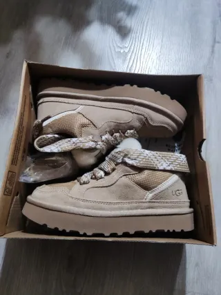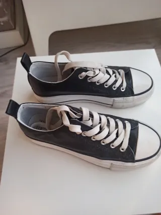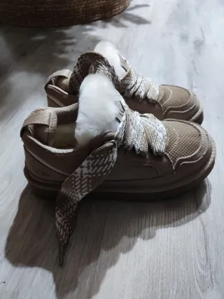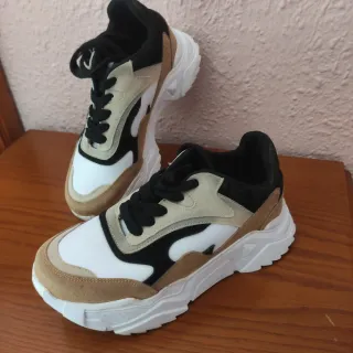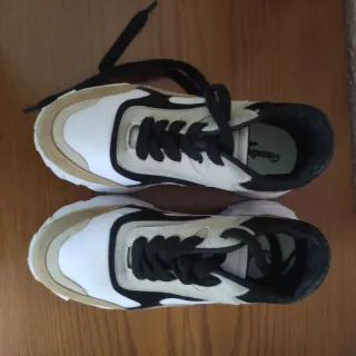 Zapatillas de moda con un diseño moderno y combinaciones de colores. - Combinación de beige, negro y blanco. - Cordones negros. - Detalle de logo en la plantilla. Son un 37 pero algo más pequeño, 36.5 porque me quedan muy justas. Usadas un rato, en perfecto estado
