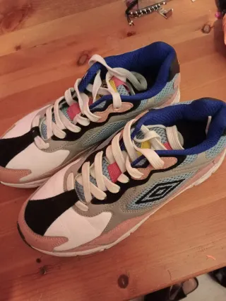 Zapatillas deportivas Umbro con un diseño llamativo. - Combinación de colores blanco, rosa, azul y negro. - Detalle del logo de Umbro en el lateral.