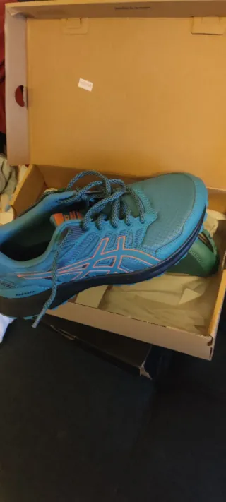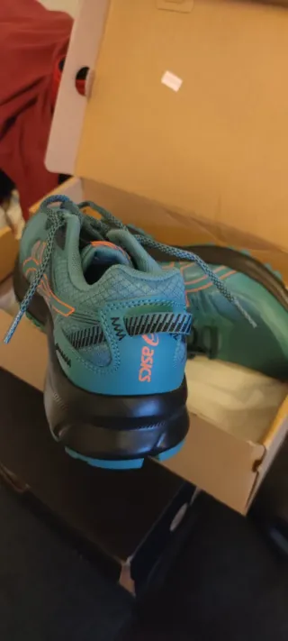 Zapatillas deportivas ASICS con un diseño moderno y llamativo. - Combinación de colores azul y naranja. - Cordones a juego con el diseño.