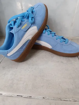 Zapatillas Puma Palermo para mujer en color azul y blanco. Un diseño clásico y cómodo. Sin caja. - Parte superior de ante y detalles sintéticos. - Suela de goma para mayor durabilidad. - Logo de Puma en el lateral y la lengüeta.