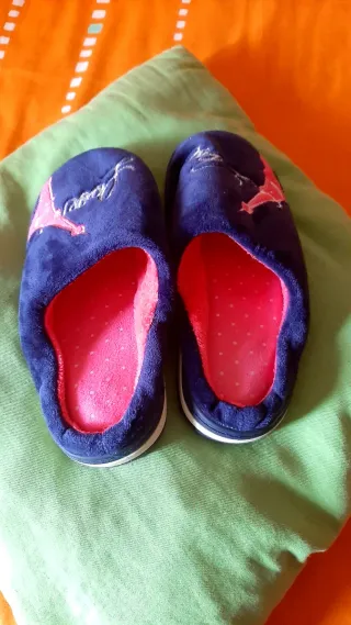 Muy cómodas y calentitas. De imitación terciopelo azul y forradas rosa. Detalle Torre Eiffel en rosa y la palabra 'Love" en blanco. A estrenar. Nunca puestas. Talla 39-40.