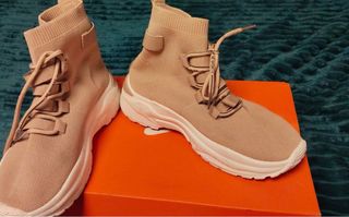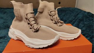 Zapatillas de estilo deportivo en tono beige con detalles blancos. - Diseño tipo calcetín. - Cierre con cordones. - Tiras decorativas. - Suela gruesa blanca.