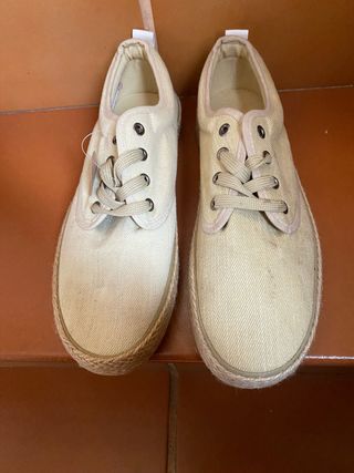 Zapatillas estilo alpargatas en color beige. - Cierre con cordones. - Detalle de esparto en la suela. - Material textil.