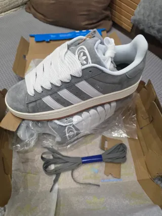 Zapatillas Adidas Campus en tonos grises y blancos. Un clásico renovado. - Exterior de ante. - Detalle de las tres rayas icónicas de Adidas. - Suela de goma. - Incluye cordones blancos y grises.