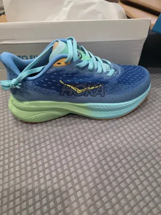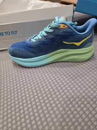 Zapatillas deportivas Hoka con un diseño moderno y llamativo. - Combinación de colores azul y verde. - Detalle del logo Hoka en contraste.