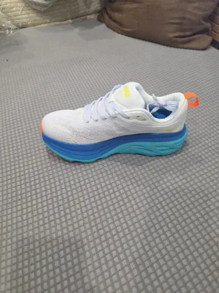 Zapatillas deportivas Hoka con un diseño moderno y llamativo. - Parte superior de malla transpirable en blanco. - Mediasuela con degradado en tonos azules y turquesa. - Detalle de logo Hoka en amarillo. - Tirador trasero en color naranja.