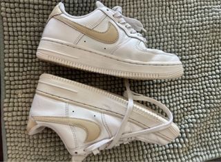 Vendo estas Nike Air Force 1 Low originales en una combinación de colores: blanco con detalles en dorado y beige. • Detalles especiales: logo de Nike y lengüeta en color dorado suave. • Mini logo bordado en dorado en la parte delantera. • Chapa metálica en los cordones también en acabado dorado. • Talla: 36 EUR / 5.5 US / 3 UK (22.5 cm). • Estado: En muy buen estado general. La piel está bien conservada, las suelas tienen mucha vida por delante y el interior está limpio. Se pueden apreciar marcas de uso mínimas propias de haber sido usadas un par de veces. • Autenticidad: 100% originales. Viene en codigo en la etiqueta de una foto