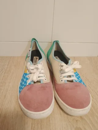 Zapatillas de la marca Morrison. Número 37. Poco uso. - Ante - Diseño con paneles de cuadros azules y detalles en rosa y amarillo. - Ribete en color verde. - Cierre con cordones blancos.