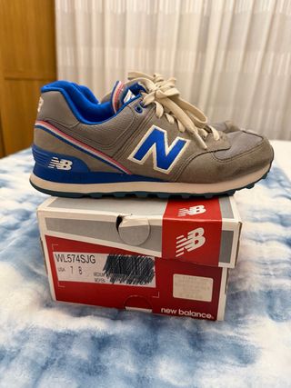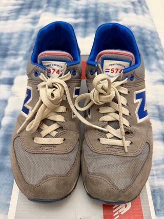 Zapatillas deportivas New Balance modelo 574. - Diseño moderno con detalles en azul y rosa. - Combinación de ante y malla. - Suela de goma para mayor durabilidad.