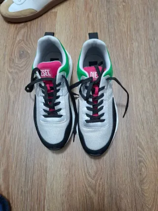 Zapatillas de la marca Diesel con un diseño moderno y llamativo. Están como nuevas a estrenar, tienen un uso. La talla marca un 40 pero son como un 40.5 que siempre uso en todas - Combinación de colores verde y plateado. - Cierre con cordones negros. - Detalle de logo en la lengüeta.