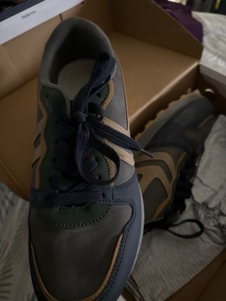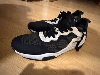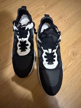 Zapatillas de estilo casual con un diseño moderno y versátil. - Combinación de materiales en la parte superior. - Cordones negros para un ajuste seguro. - Suela de goma duradera. son 43 pero pequeñas son como un 42 una puesta solo al gastar 43 me las puse y no pude llevarlas tan solo las tuve una hora puestas