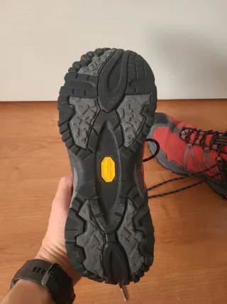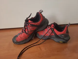 Zapatillas de senderismo Trango World en tonos grises y rojos. - Diseño deportivo. - Cordones negros. - Suela Vibram. Calzado de senderismo en bastante buen estado, suela de mucha garantía. Perfectas para la práctica de senderismo, no se nota ni una piedra. Ligeras y muy cómodas.
