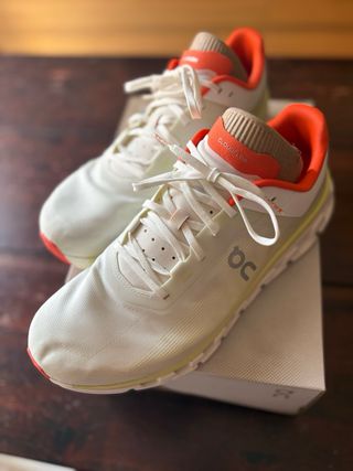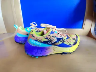Zapatillas de trail running Joma TR 7000. - Diseño con detalles en verde, naranja y amarillo. - Parte superior en blanco y gris. - Suela con buen agarre. 12 kilómetros de uso me están grandes las vendo por eso las suelas se ve que no lleva nada de desgaste
