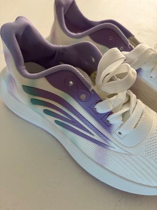 Zapatillas deportivas con un diseño moderno y llamativo. - Combinación de blanco y morado con detalles en turquesa. - Cierre con cordones blancos. - Suela blanca.