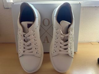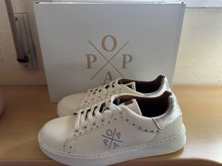 Zapatillas de la marca Popa en color blanco con detalles plateados. Solo puestas una vez porque me estan pequeñas, en perfecto estado. - Diseño con tachuelas. - Detalle plateado en el talón. - Logo de la marca en el lateral.