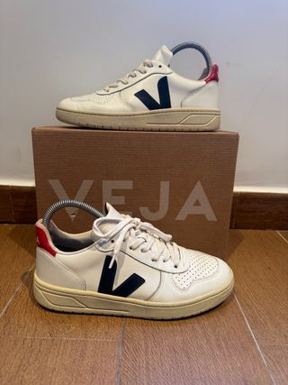 👟 Vendo Zapatillas VEJA V-10 - Blanco/Azul Marino/Rojo (Talla 38) 👟 ¡Icono de estilo y sostenibilidad! Vendo zapatillas Veja V-10 en talla 38. Son el modelo clásico y atemporal en color blanco, con el logotipo "V" lateral en negro y el detalle del talón en rojo. Características: Talla: 38 EUR Modelo: V-10 Color: Blanco principal, con detalles en negro y rojo. Estado: Usadas, pero en buen estado general. Presentan el desgaste normal en la suela y pequeños roces propios del uso, lo que les da un look ligeramente vintage que está muy de moda (mira las fotos para ver el estado real). #Veja #VejaV10 #ZapatillasVeja #Sneakers