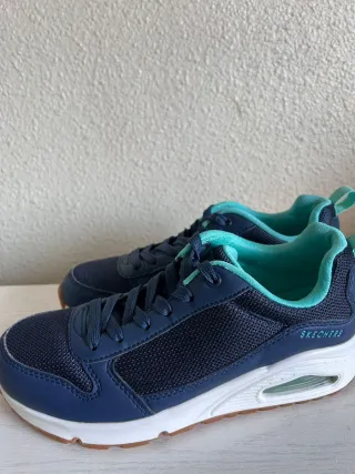 Zapatillas deportivas Skechers en tonos azul marino y turquesa. - Diseño moderno y cómodo. - Detalle de logo en el lateral. - Suela blanca con detalles en goma.
