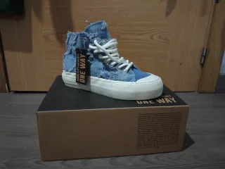 Zapatillas altas de estilo urbano con un diseño desgastado en denim. - Cierre de cordones blancos. - Suela de plataforma blanca. - Detalle de etiqueta D.Franklin ONE WAY. Nuevas a estrenar!