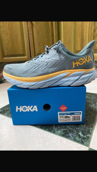 Zapatillas deportivas Hoka Clifton 8 en color gris y naranja. - Modelo: M Clifton 8 Wide - Talla: 12 2E (equivlente 46 2/3 EUR) - Color: Gris con detalles en naranja y suela azul claro.