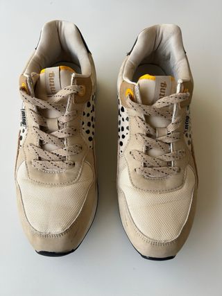 Zapatillas de la marca Mustang con un diseño llamativo. - Combinación de colores beige y detalles multicolor. - Estilo deportivo y moderno. Arañazos en lateral interno de ambas zapatillas (visible en la fotografía).