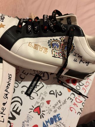 Zapatillas de diseño único con un estilo vibrante y llamativo. Perfectas para añadir un toque de color a tu look. - Detalle de corona y LOVE pintado a mano. - Cordones con logo DOLCE & GABBANA. - Inscripción I'm u King en el lateral. - Diseño Like a superhero en la suela interior. -Zapatillas con uso pero bien cuidadas -Su precio en tienda me costaron mas de 700 euros -Originales de piel de becerra