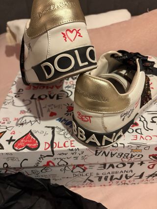 Zapatillas de la marca Dolce & Gabbana Portofino Con un diseño vibrante y llamativo. Hecho en Italia Características: blanco cierre con cordones en la parte delantera y logo de la marca en cierre de belcro color oro puntera redonda suela de goma con aplique del logo Suela: Goma 100% Exterior: Piel de napa 100% Usada solos una vez para videoclip