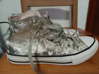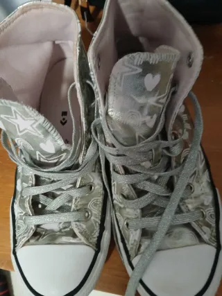 Zapatillas Converse de edición limitada con un diseño único. - Estampado de estrellas y corazones. - Cordones plateados brillantes. - Diseño de caña alta.