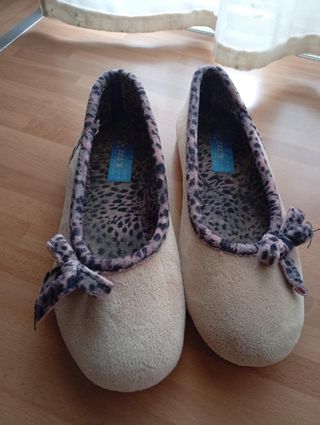 Comodísimas zapatillas de estar por casa de la marca Women Secret. - Exterior de tejido suave en color beige. - Suela goma agarrable 100%. - Interior con estampado animal print. - Detalle de lazo en la puntera. - Ribete decorativo en el cuello.