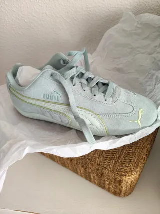 Zapatillas deportivas Puma para mujer en tonos azules y verdes. Un diseño moderno y cómodo. - Detalle de franjas laterales. - Logo de Puma bordado.