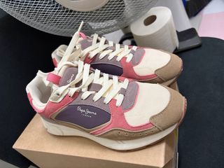 Zapatillas de la marca Pepe Jeans con un diseño moderno y colorido. - Combinación de colores beige, rosa y morado. - Detalle del logo de Pepe Jeans London en el lateral. - Cordones de color crema.