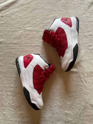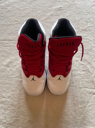 Zapatillas deportivas Jordan en llamativos colores rojo y blanco. - Diseño deportivo. - Cordones negros.