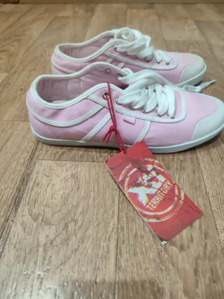 Zapatillas deportivas con un diseño llamativo y colores vibrantes. - Exterior de ante rosa. - Detalle de talón en piel verde. - Suela de goma marrón. - Cordones rosas a juego. Totalmente nuevas, compradas en El Corte Ingles. Talla 39, precio original 69€. Marca Tintoretto.