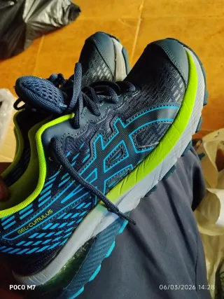 Tenis deportivos ASICS Gel-Cumulus en tonos azules y verdes. - Diseño moderno y llamativo. - Detalle de franjas azules en los laterales. - Suela con amortiguación visible.