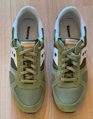 Zapatillas Saucony Shadow en color verde, mostaza y blanco. - Totalmente nuevas, sin ningún tipo de uso. Envio con caja de Saucony que no es la original puesto que la envié en otro pedido. - Parte superior de ante, piel y malla. - Suela de goma triangular para mayor tracción. - Ticket de compra y precio original pagado de 115€ con rebajas. Su precio sin rebajas son 130€. - Muy cómodas y duraderas - Tallan justas, asi que puede valer para 44 y 44,5.