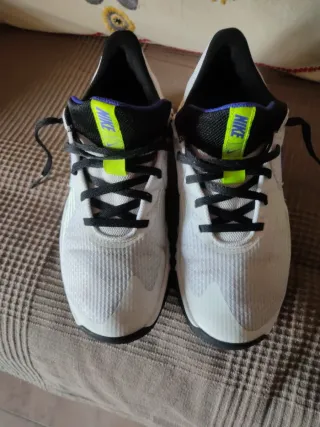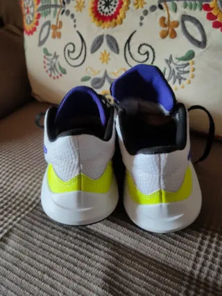 Zapatillas deportivas Nike en color blanco con detalles en lima y morado prácticamente nuevas solo probadas. - Diseño moderno y ligero. - Cierre con cordones negros. - Logo de Nike en la lengüeta.