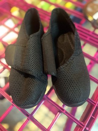 Zapatillas diseñadas para pies anchos o hinchados, ofreciendo adaptabilidad, en color negro, con trabilla de velcro para ajustar al pie en parte superior. Material exterior transpirable, con una plantilla adaptable en el interior, suela de goma que no escurre.