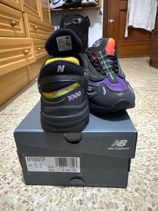 Zapatillas New Balance M1000 en color negro y morado. Diseño moderno y llamativo. - Detalles en colores vibrantes. - Número de modelo 1000 visible.