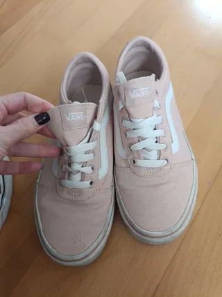 Zapatillas de la marca Vans en color rosa, talla 37. Muy bonitas y versátiles para el día a día. - Diseño clásico de Vans. - Cordones blancos. - Raya lateral característica de la marca.
