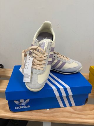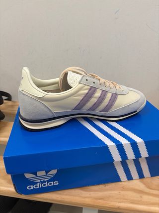 Zapatillas Adidas SL72 en tonos beige y morado. Un diseño clásico y llamativo. - Combinación de ante y material sintético. - Detalle de las tres franjas en morado. - Cordones en tono beige.