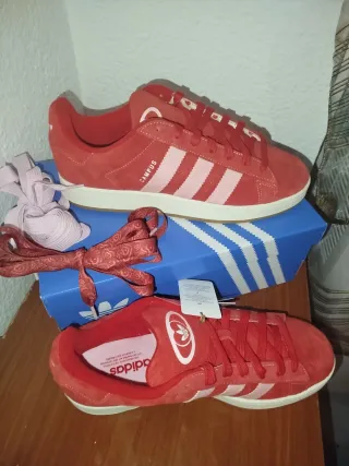 Zapatillas Adidas Campus en color rojo y rosa. El material es ante. - Cierre de cordones. - Suela de goma. - Detalle de las tres bandas. Con dos cordones extra Talla 45 1/3