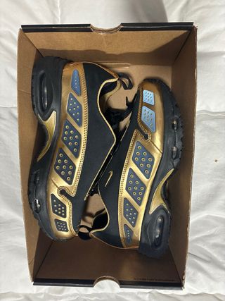 Zapatillas Nike Air Max SNDR SE en colores negro y dorado. Un diseño llamativo y moderno. - Combinación de materiales en negro y detalles dorados. - Paneles con perforaciones en azul y dorado.