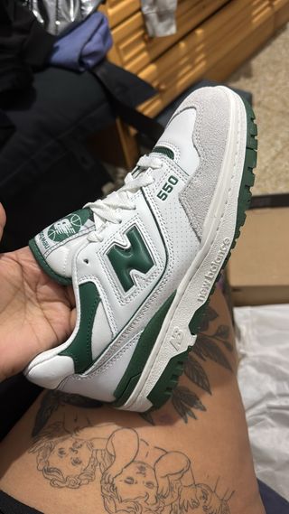Zapatillas New Balance 550 con un diseño clásico y deportivo. - Combinación de colores blanco y verde. - Detalle del logo 'N' en verde. - Número '550' en el lateral. Talla EURO 39.5, USA 6.5