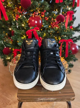 Zapatillas Fendi de cuero negro con detalles dorados. - Cierre con cordones. - Suela de goma blanca. - Logo Fendi en la lengüeta.