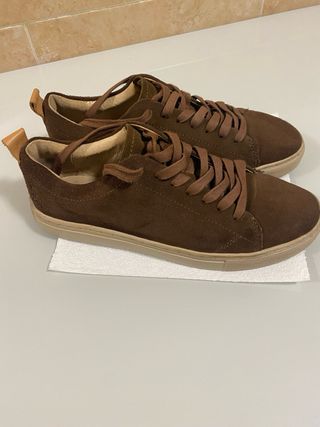 Zapatillas de ante en color marrón. - Cierre con cordones. - Detalle de lengüeta en la parte trasera. - Suela de goma. - Tiene por dentro un poco desteñido de la lengüeta, ver última foto