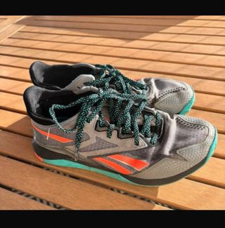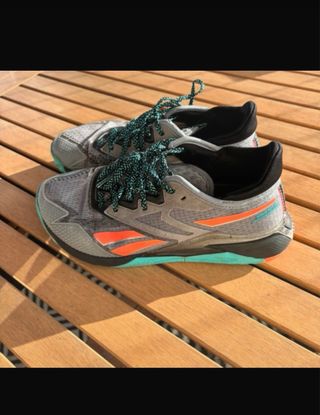Zapatillas deportivas Reebok Nano, ideales para entrenamiento de CrossFit. - Diseño en gris con detalles naranjas y turquesa. - Cordones con patrón de puntos en verde y negro. - Suela con buen agarre.