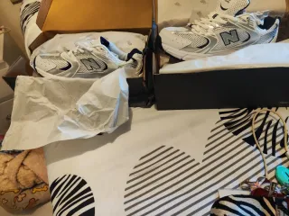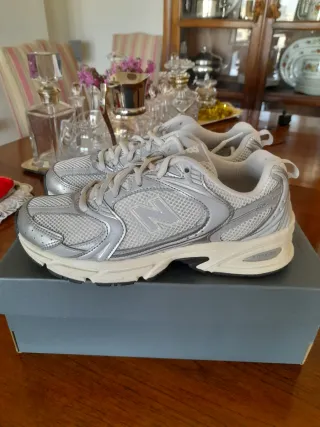 Zapatillas deportivas New Balance 530 en tonos plata y blanco, como nuevas compradas en octubre y puestas dos veces. Perfectas para el día a día. - Diseño deportivo. - Cierre de cordones.