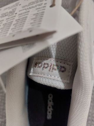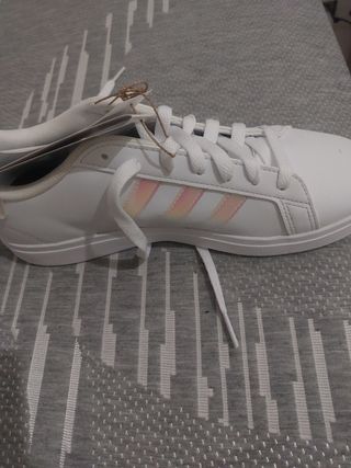 Zapatillas deportivas Adidas en color blanco. Perfectas para el día a día o para hacer deporte. Talla 37 1/3. ¡¡¡¡SIN ESTRENAR!!!! Caja original. - Diseño moderno con las tres franjas. - Cierre de cordones. - Suela de goma.