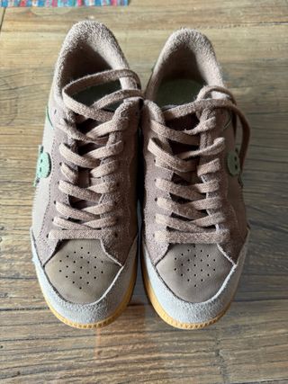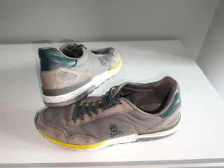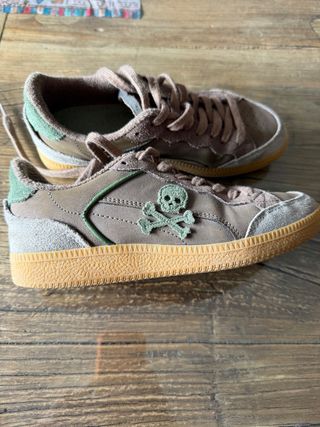 Zapatillas lifestyle de la marca Scalpers en talla 37. Diseño casual con detalles distintivos. Poco uso - Color principal marrón. - Detalle de calavera y tibias cruzadas en verde. - Suela de goma. - Paneles de ante y tela.